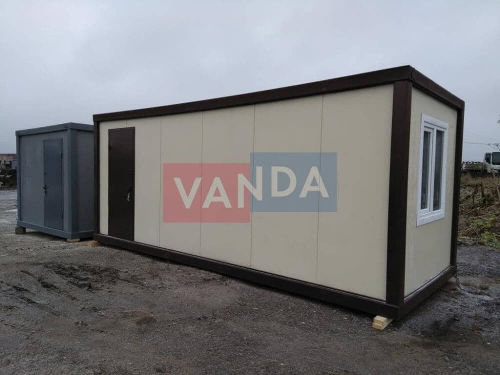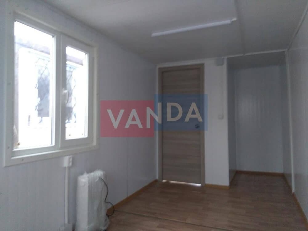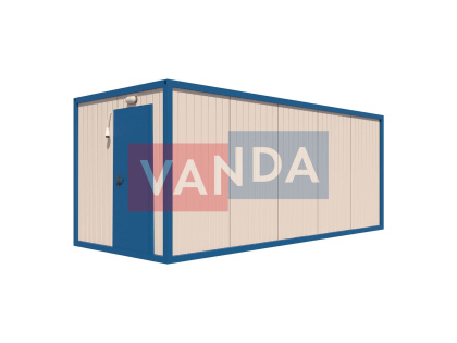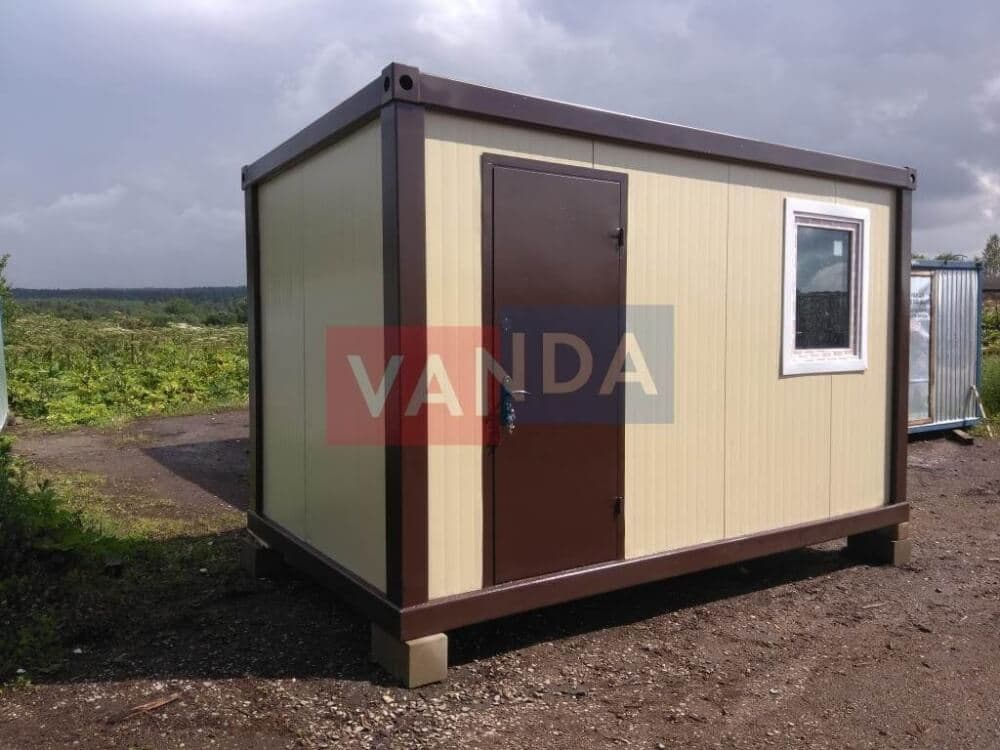 Данный контейнер не требует обустройства тяжеловесного фундамента, поскольку постройка легкая и устойчивая. Данный блок-контейнер может быть выполнен абсолютно любого размера и формы по эскизу заказчика.Контейнер состоит из металлического сварного основания. Стены изготовлены из сэндвич-панелей с прокладкой утеплителя. Крыша покрыта крашенным холоднокатаным металлом 1,2 мм. Помещение обустроено пароизоляцией при помощи технической пленки, которая проложена на полу и потолке. Внутренняя облицовка потолка выполнена из ПВХ-панелей, пол – из шпунтованной доски. Вход в помещение оборудован запирающейся металлической дверью.